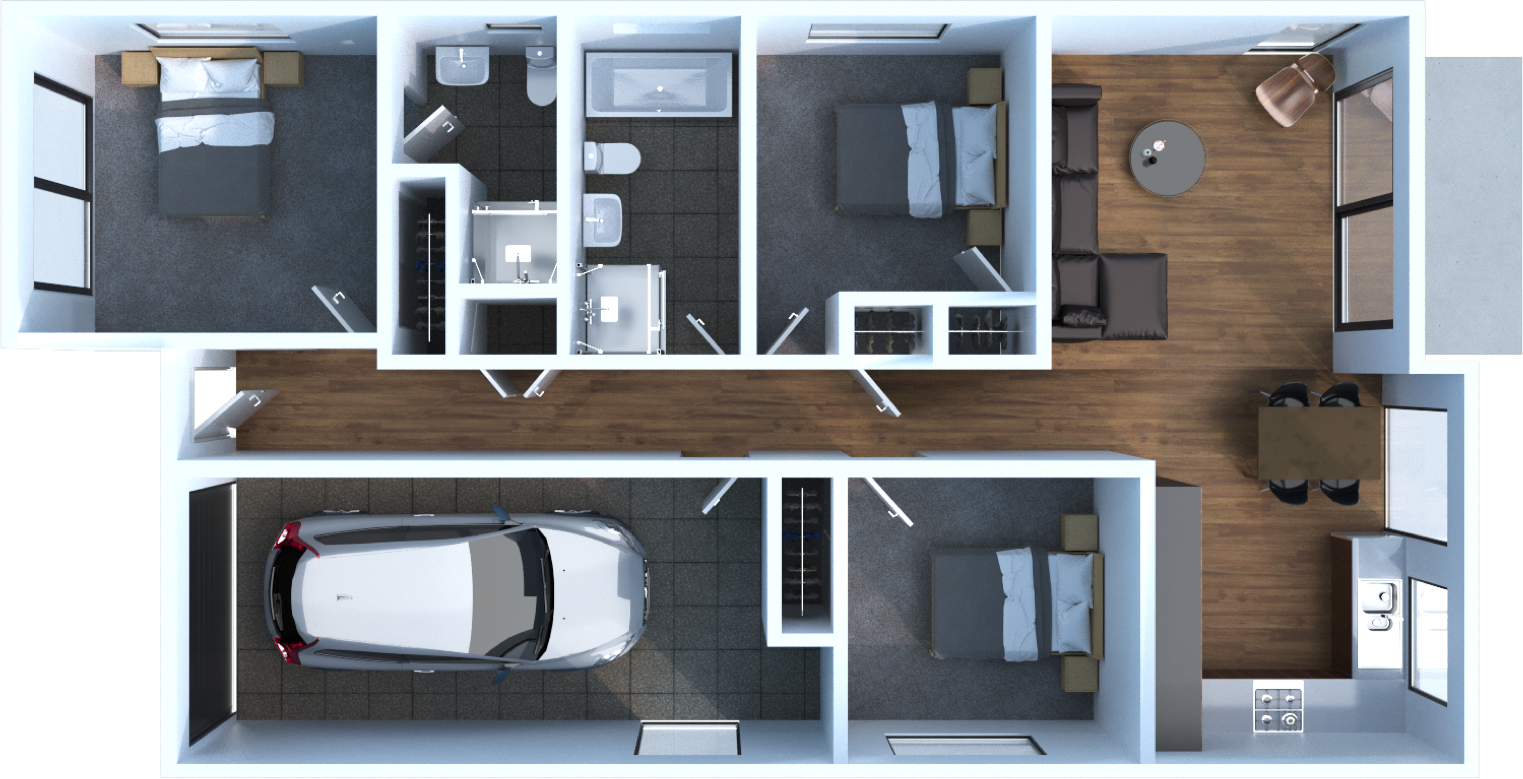 At 105m2, these standalone three-bedroom, two-bathroom homes occupy a 317m2 section close to country schools, local shops and in a lovely semi-rural community close enough to still commute to the city.